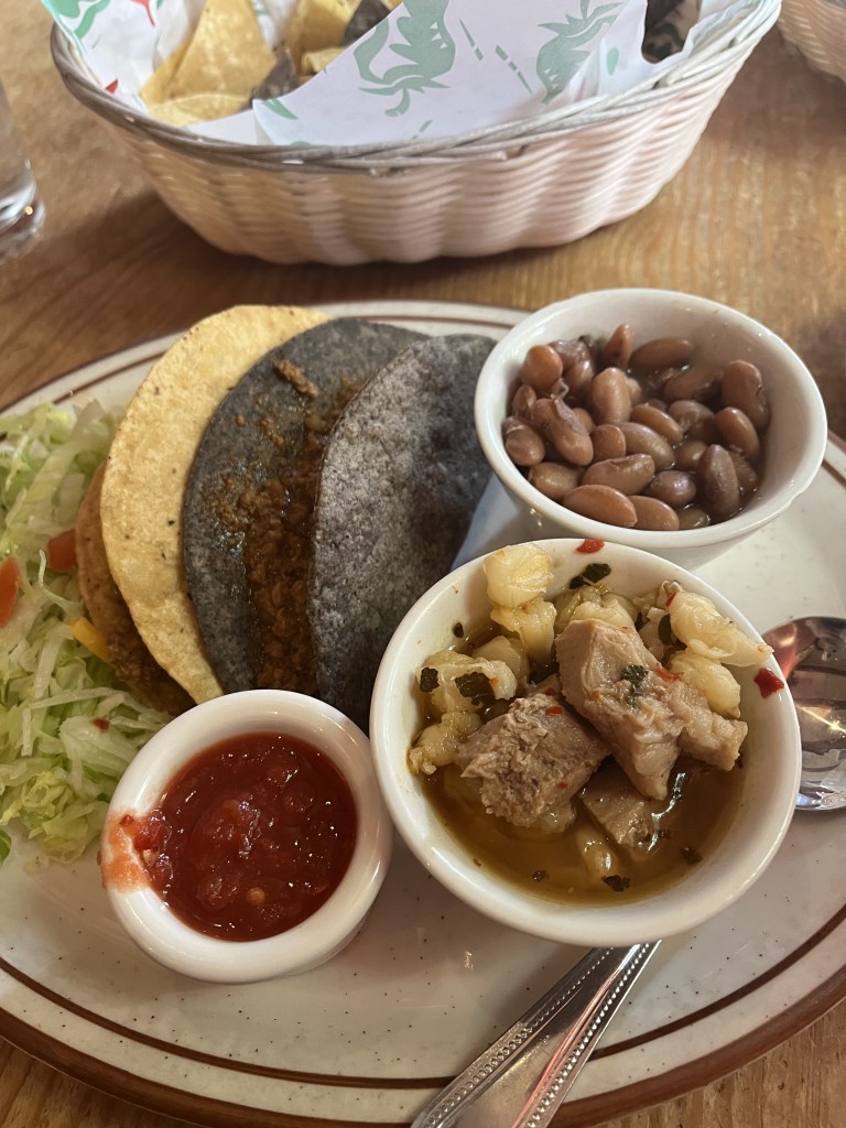 For lunch, I decided to stop by La Choza because it has amazing reviews, with some people calling it the best Mexican restaurant in the whole city. I had pretty high expectations, and La Choza did not disappoint. To start, I tried their house margarita with prickly pear, which was highly-recommended in reviews. The margarita was incredibly fresh and not too sweet – just my style! I also got an order of their chips and guacamole. While the guacamole wasn’t as chunky as I usually like it, the flavor was amazing and I loved the addition of blue corn chips. For my entree I tried the crisp taco plate with green chile beef. The taco itself was amazing and the green chile beef was super flavorful. The plate also came with beans and posole, a type of pork/hominy soup that I had never tried before and really enjoyed. I chose a sopapilla for my side item which was super simple but surprisingly delicious, even though I totally forgot to try it with honey!